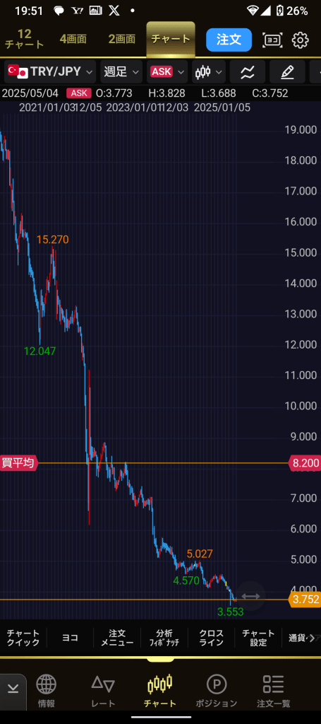 でも今3.752円なら、今後下がる余地も3.752円のみ。ここからのトルコリラ売りに私は魅力を感じないのですが…それでもそれでもまだ下がるのでしょう…はぁぁ…